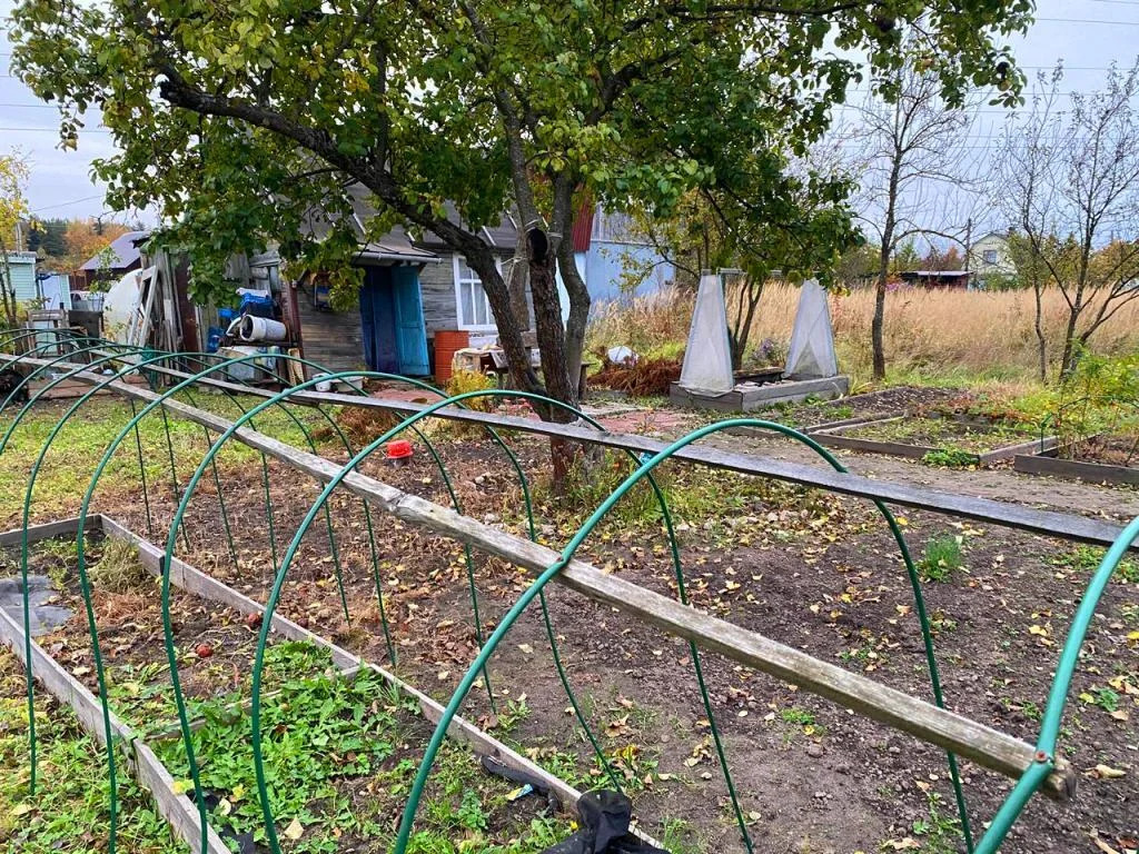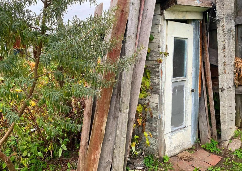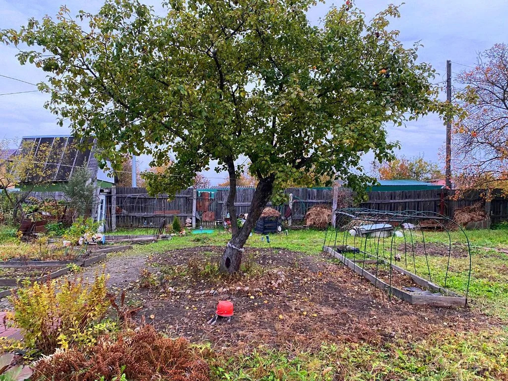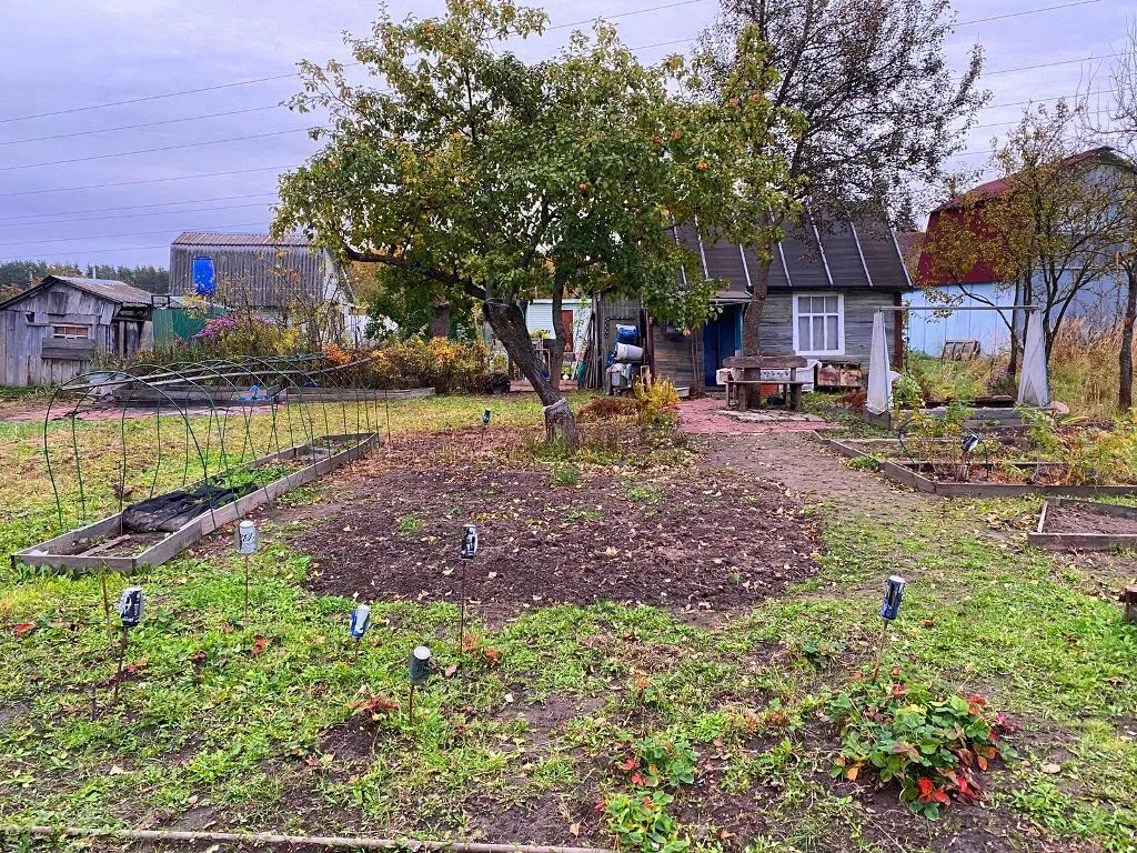 На участке колодец, маленький садовый домик с новой кровлей, туалет, плодовые деревья, грядки, цветы.